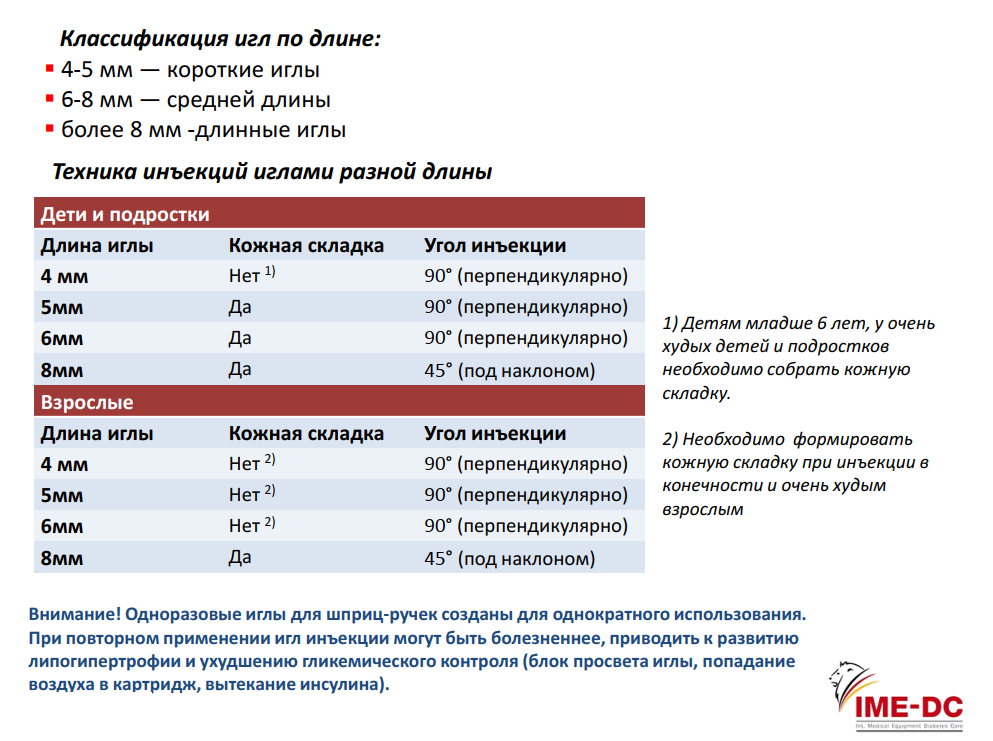 Благодаря новейшим технологиям игла приобрела заточку «Soft feel», которая не разрезает ткань, силиконовое покрытие позволяет раздвигать кожные волокна и проникать внутрь безболезненно. Создан увеличенный внутренний диаметр за счет сокращения толщины стенок иглы, это позволяет достичь оптимального потока инсулина. Заживление места укола происходит гораздо быстрее. Иглу рекомендуется использовать однократно. Повторное применение может способствовать попаданию воздуха в картридж, вытеканию инсулина, блоку просвета иглы, болезненным ощущениям при инъекции. Иглы IME-FINE и DEXFINE являются универсальными и могут использоваться с любыми шприц-ручками. Например: